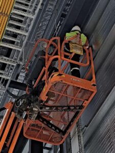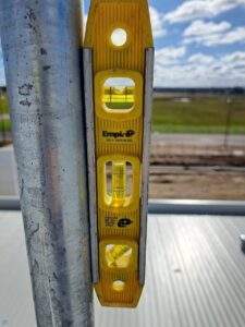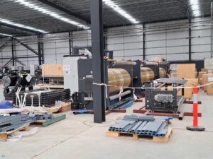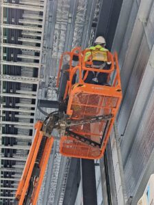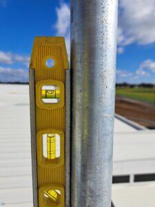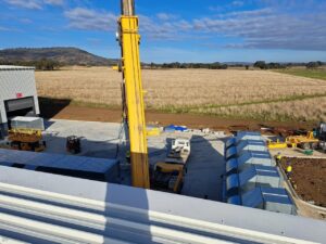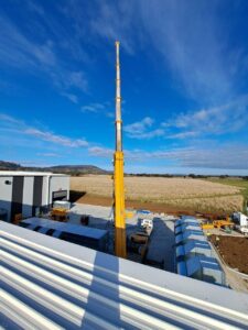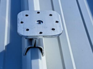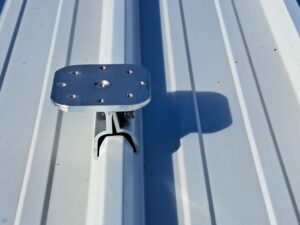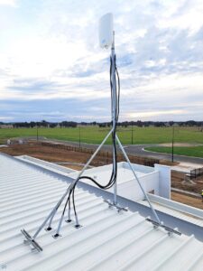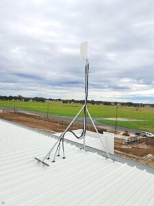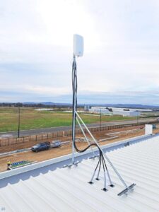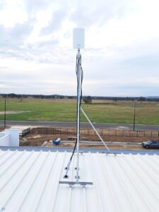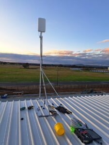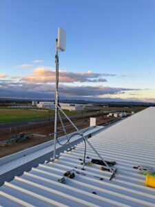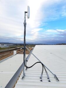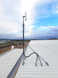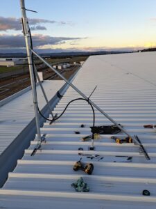 On site, we had access to both a scissor lift and knuckle reach boom to assist with the installation which greatly helped. As this was an industrial building and the roof profile was Kliplock, we utilized the wide set Kliplock brackets to attach slotted channel to the roof profile rather than drill holes into the roof to attach the antenna bracket to. With this setup, we can place the mast in the best possible place to access the incoming signal, rather than having to rely on the existing screw points as on a typical tin roof.