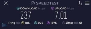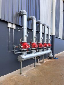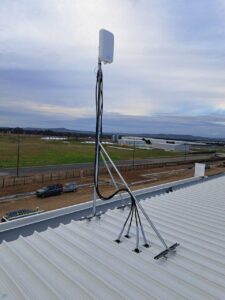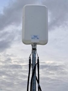 Once the best position was established, we erected the 3m serviceable mast. Atop the mast, we installed a Panorama 4×4 MiMo Panel Antenna (for future 5G service). For equipment protection, considering this mast and antenna are on top of a very large building, we installed 4 x Phaseblocker Inline Lightning protection adaptors. We then ran 4 x 25 meter LDF4-50A Coaxial cables through the roof and down to the access point to the comms room.